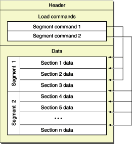 从这张图上来看,Mach-O文件的数据主体可分为三大部分,分别是头部(Header)、加载命令(Load commands)、和最终的数据(Data)。
